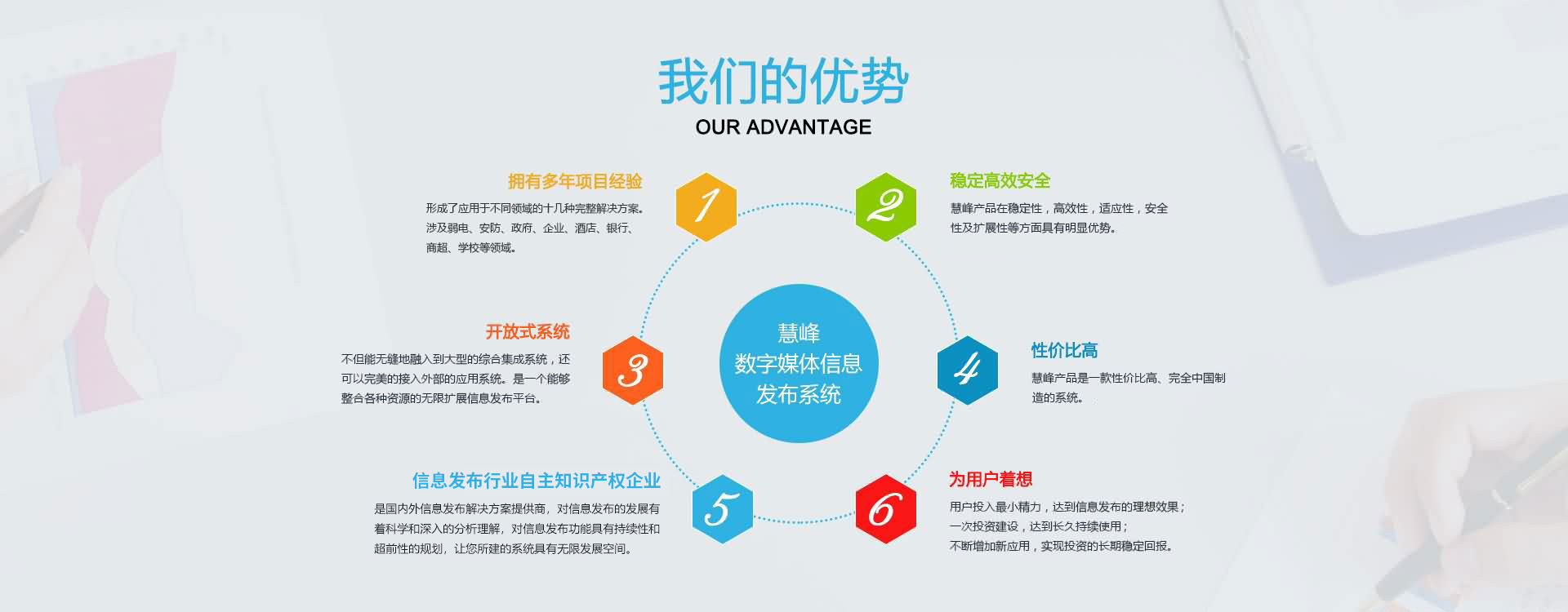 公司不僅具有開發大型項目的豐富經驗,還擁有維客計算機遠程控制系統,慧峰數字媒體發布系統,慧峰會議預約管理系統, 慧峰音視頻流媒體服務器系統,慧峰智能數據處理系統,數字化企業任務進程管理系統,智能演講提示系統,會議自動智能 排座系統等具有自主知識產權的產品。